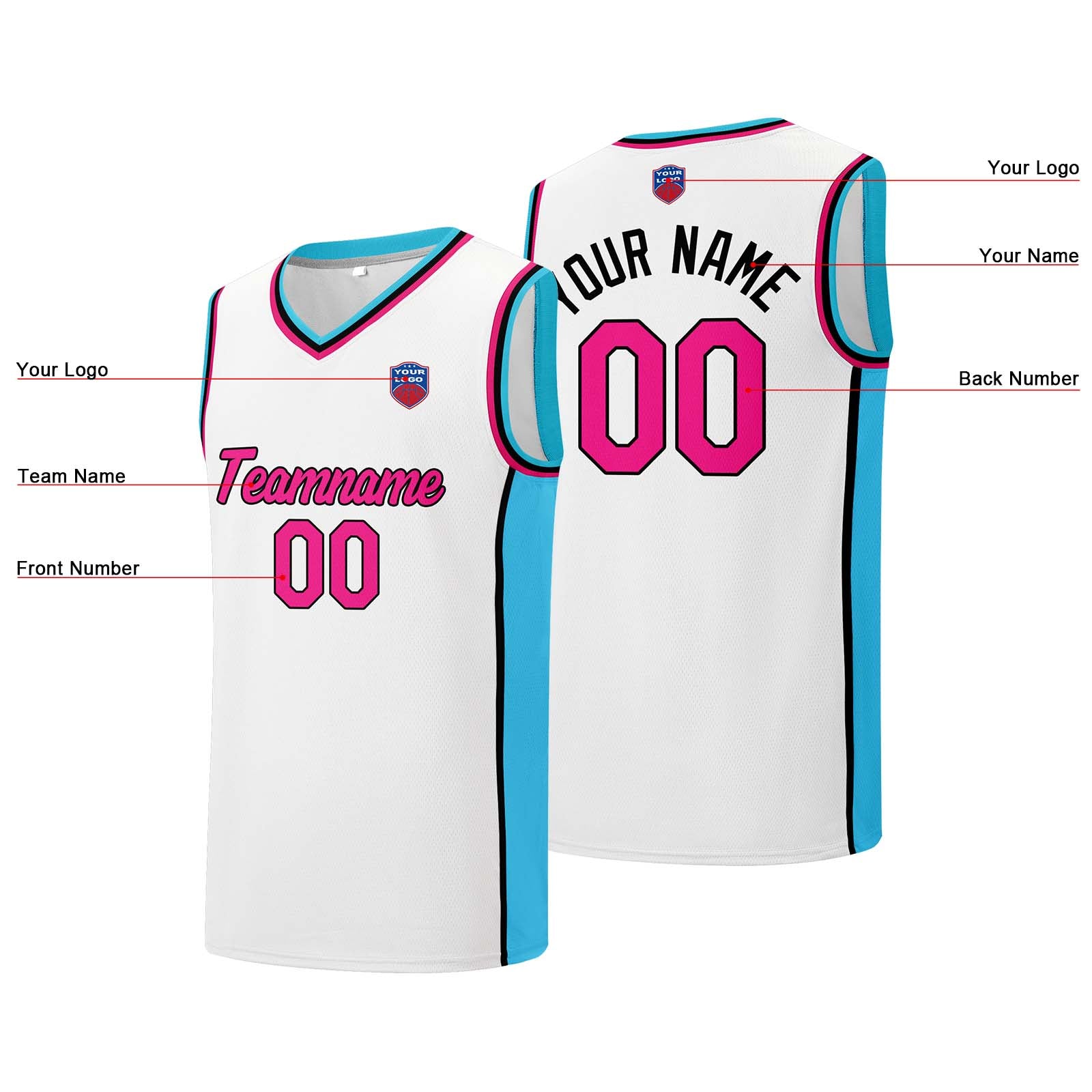 Custom basketball jersey shorts for men and women. Embroidered and printed name, number and logo White