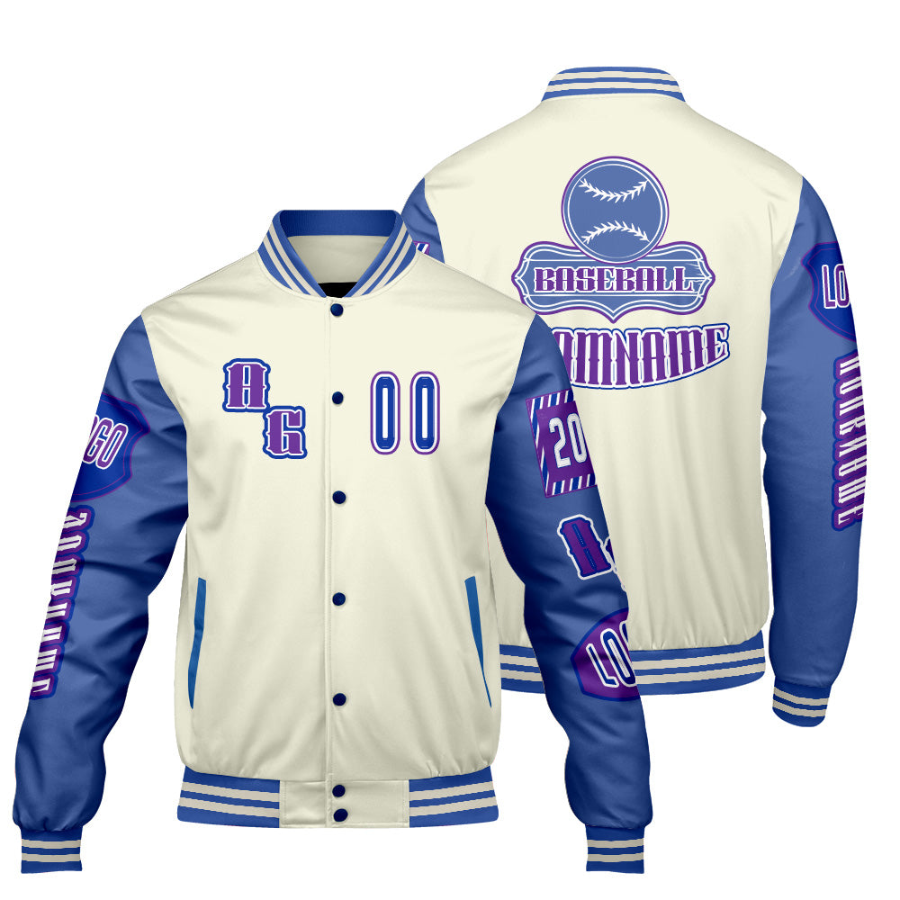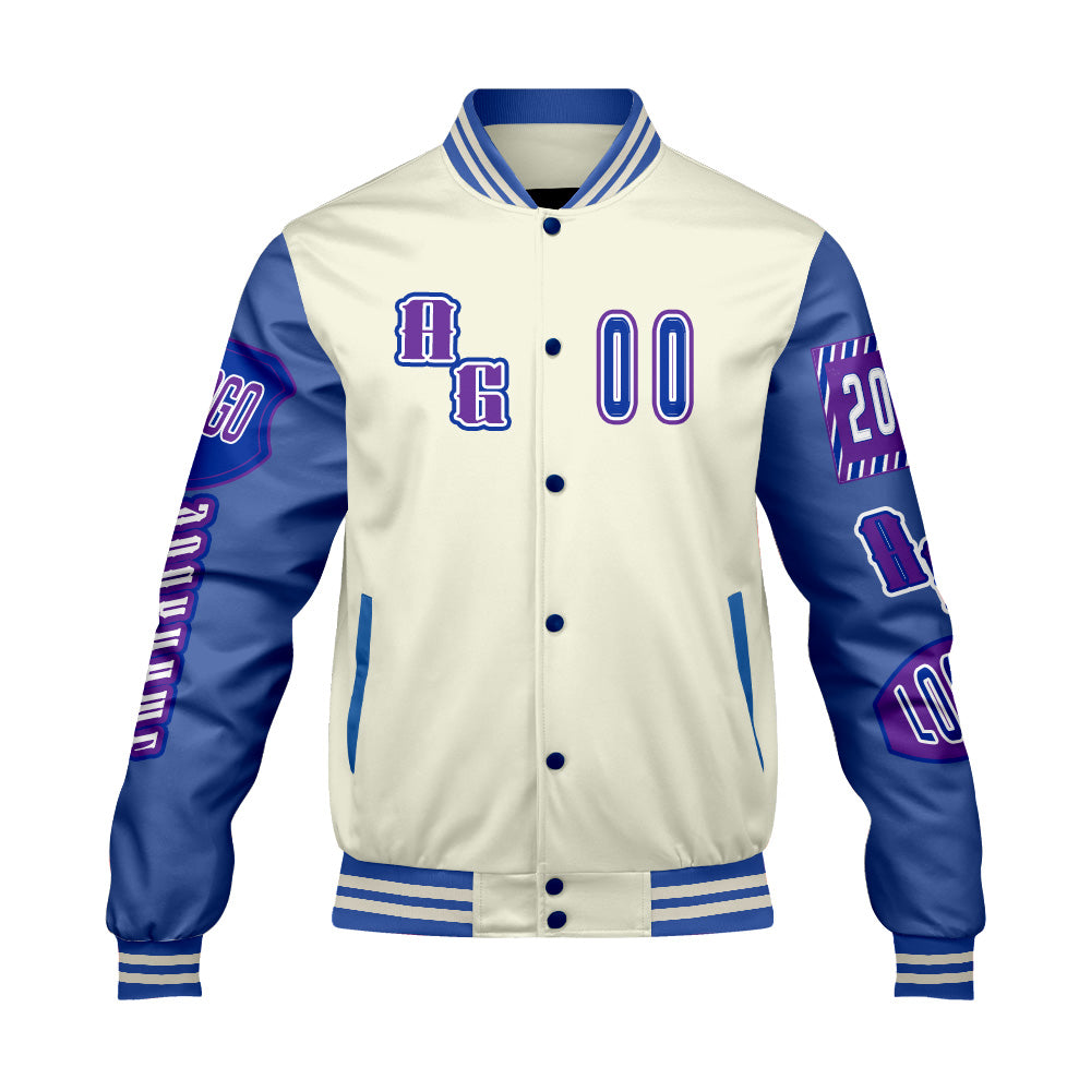 Custom White Blue Purple Letterman Varsity Jacket Personalized Embroidery Printing
