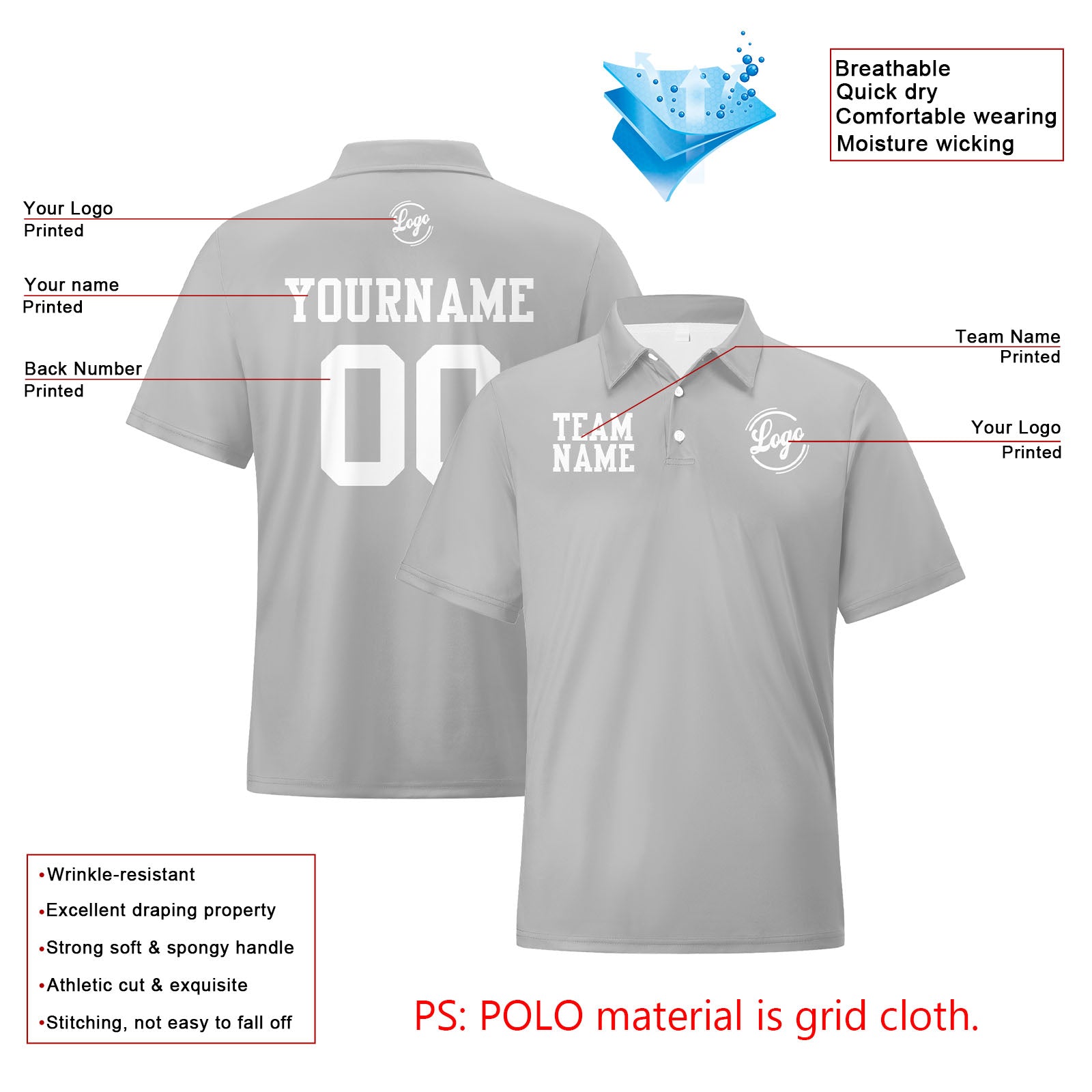 Custom Light Grey White Football Polo Shirts Add Your Unique Logo/Name/Number