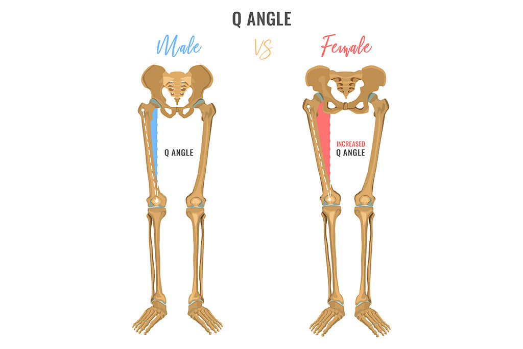 - Q angle – A woman’s childbearing hips create a more pronounced Q angle (the angle from the hips to the knees), putting additional stress on the knees.
